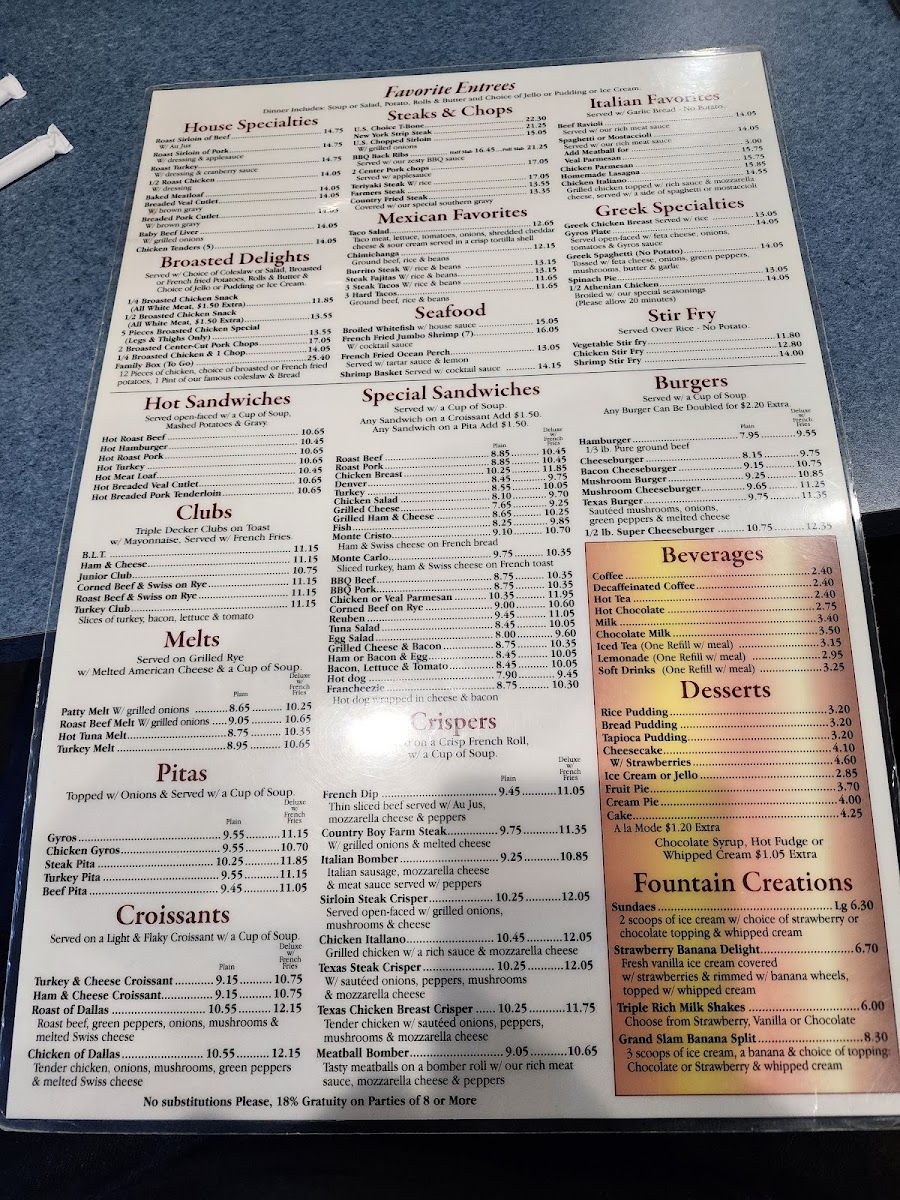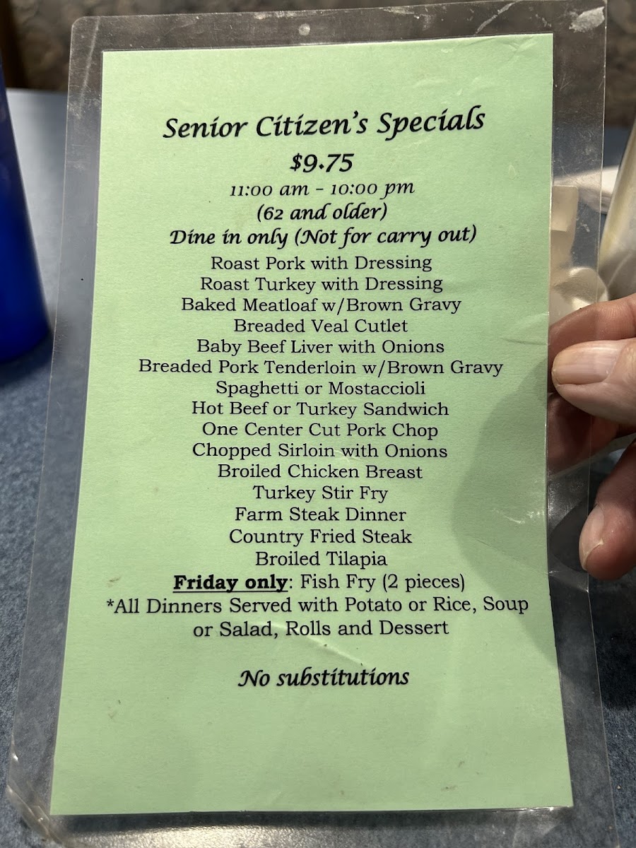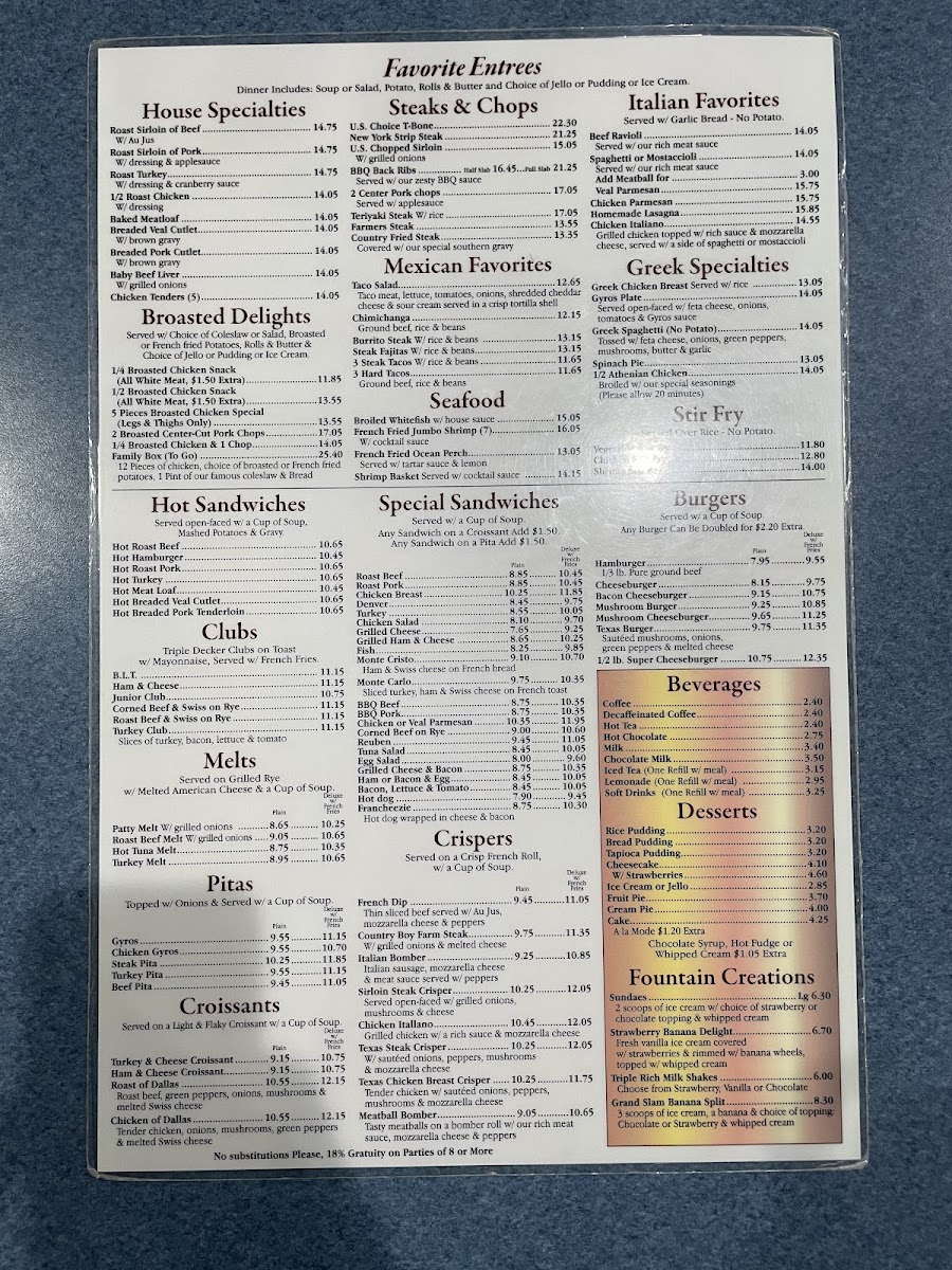 The menu also offers comforting lunch and dinner options like Chicken Soup, Baked Meatloaf with brown gravy, and Broasted Chicken Dinner, reflecting a straightforward, down-to-earth dining experience. Side orders such as golden French Fries, Mashed Potatoes, and homemade Bread Basket complement the main dishes, encouraging a relaxed meal to savor with family or friends.